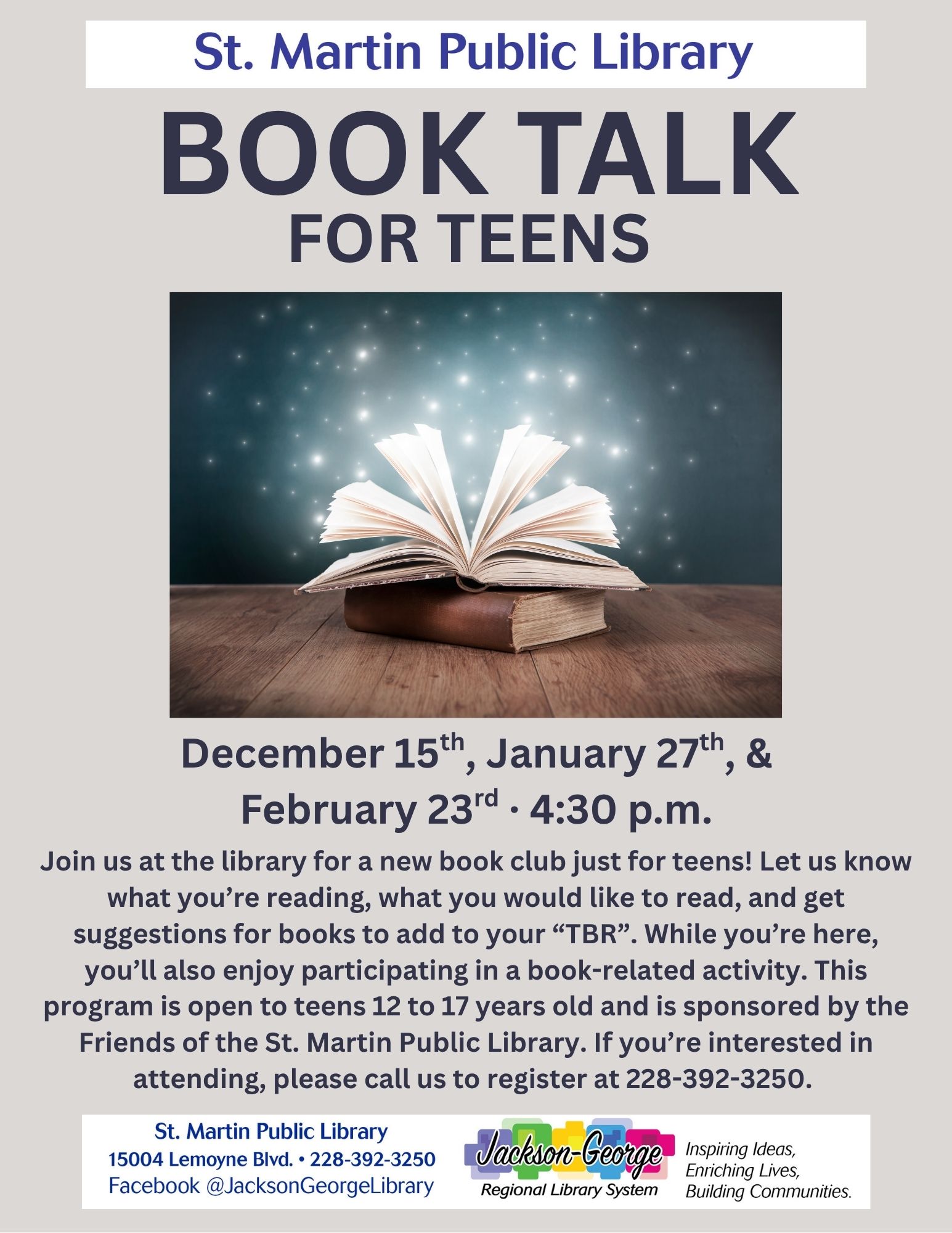 St. Martin, MS — The St. Martin Public Library is excited to announce Book Talk for Teens, a new book discussion club designed especially for young readers ages 12 to 17. Meetings will be held on December 15, January 27, and February 23 at 4:30 p.m.