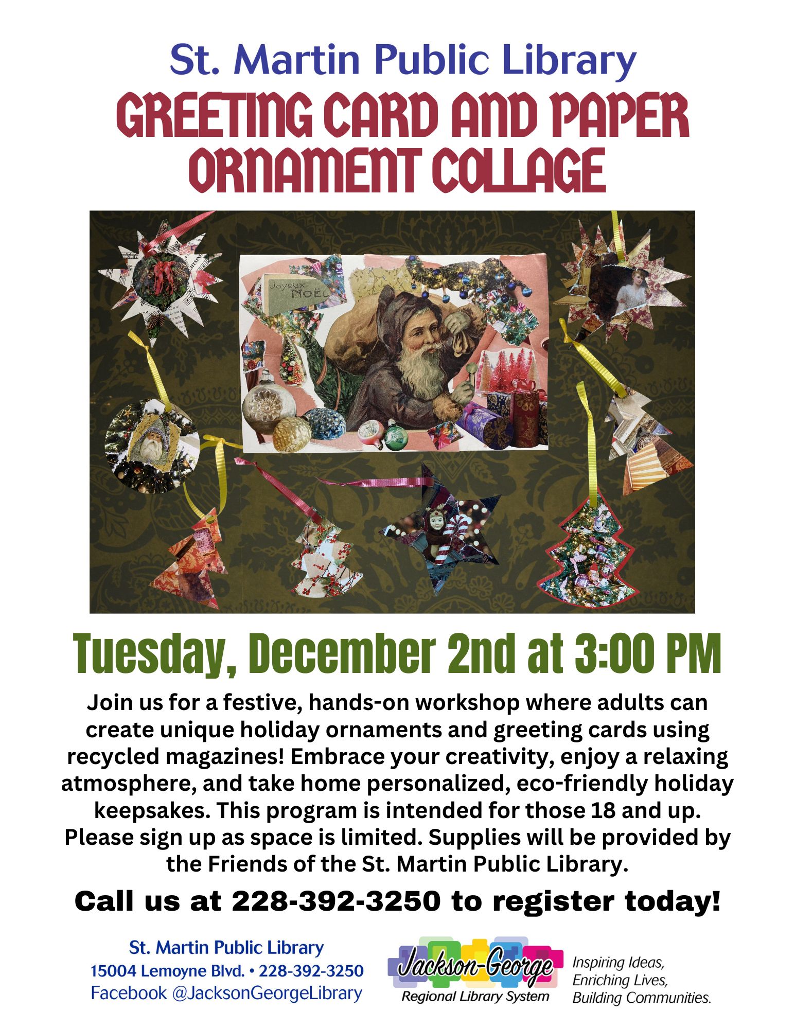 St. Martin, MS —The St. Martin Public Library invites adults ages 18 and up to get creative this holiday season at a festive crafting workshop: Greeting Card and Paper Ornament Collage, held on Tuesday, December 2 at 3:00 p.m.