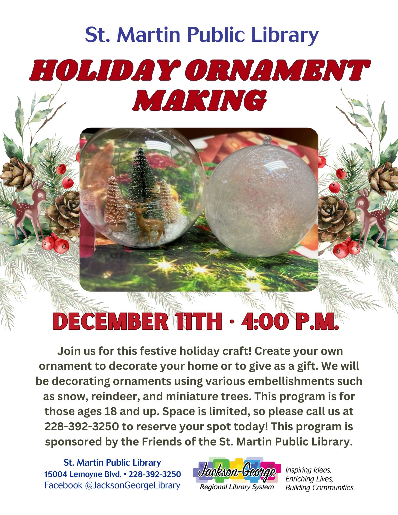 St. Martin, MS —The St. Martin Public Library invites adults ages 18 and up to celebrate the season with a festive Holiday Ornament Making workshop on December 11 at 4:00 p.m.