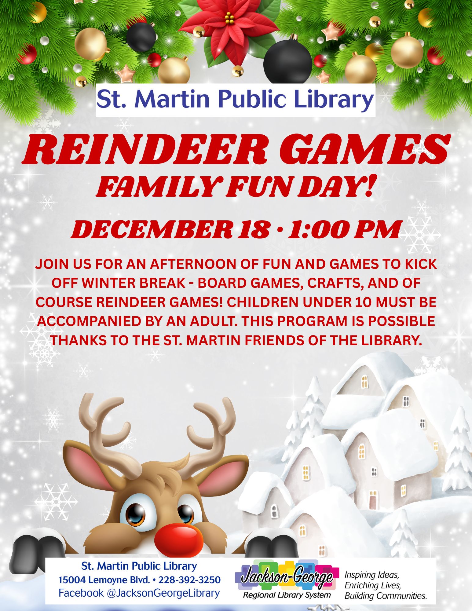 St. Martin, MS —The St. Martin Public Library invites families to jump into the holiday spirit at Reindeer Games: Family Fun Day on December 18 at 1:00 p.m.
