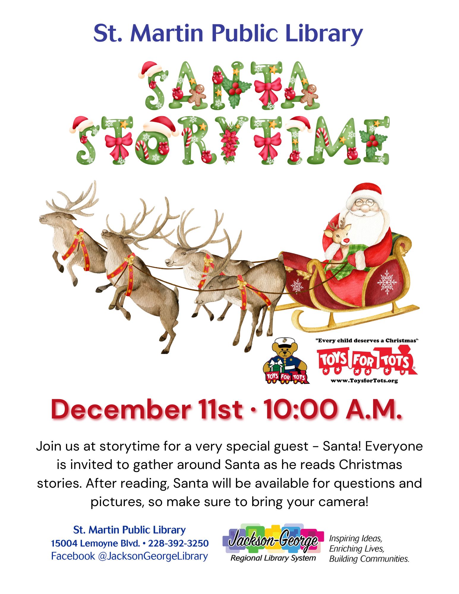 St. Martin, MS —The St. Martin Public Library invites families to a magical holiday event in partnership with Toys for Tots on Thursday, December 11 at 10:00 a.m.