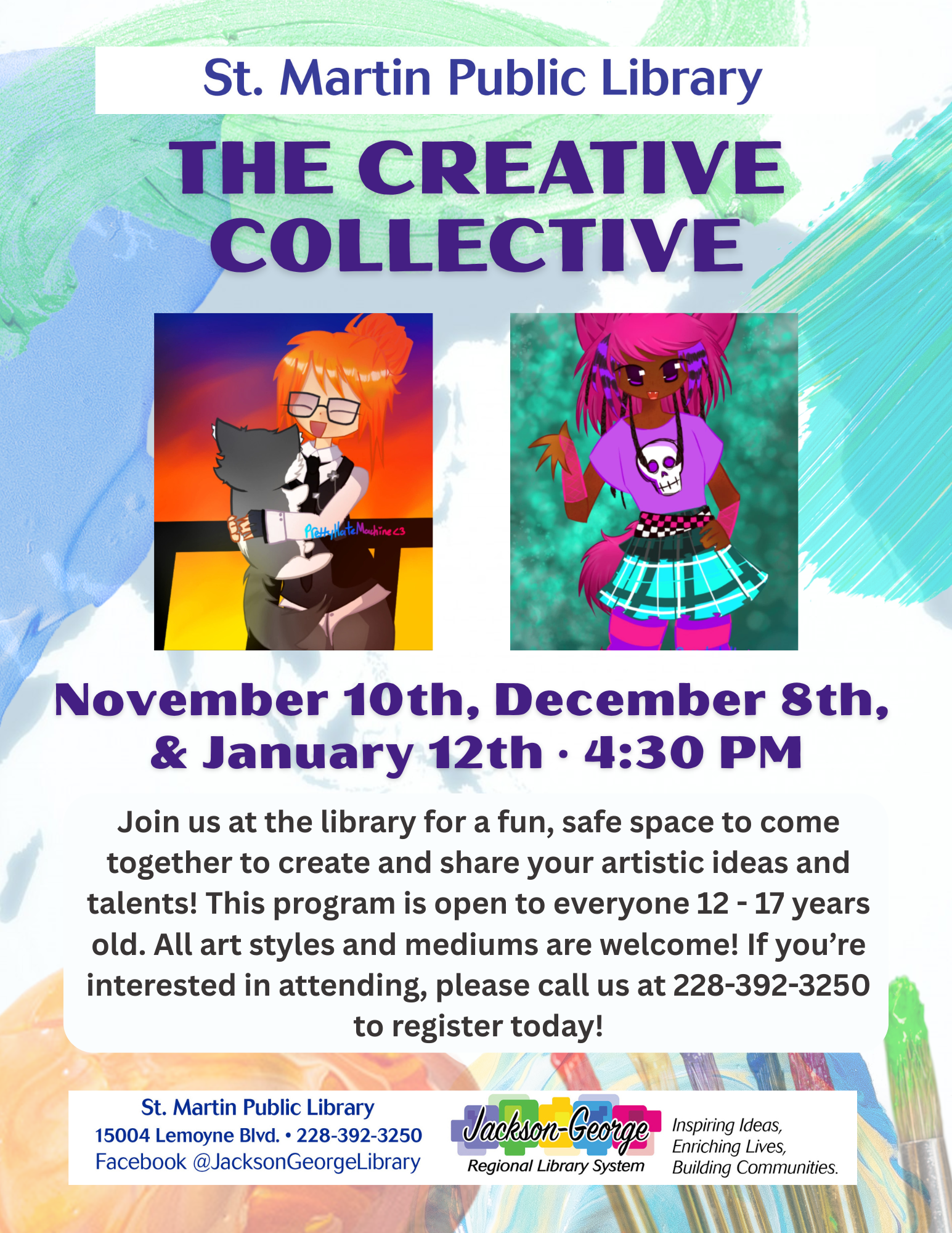 St. Martin, MS — St. Martin Public Library invites teens to join The Creative Collective, a welcoming and inspiring space for young artists to create, collaborate, and share their talents! Meetings will be held on November 10, December 8, and January 12 at 4:30 p.m. Each session offers a relaxed, judgment-free environment where teens ages 12–17 can explore their creativity across any art form, from drawing, painting, and poetry to music, digital art, and more.