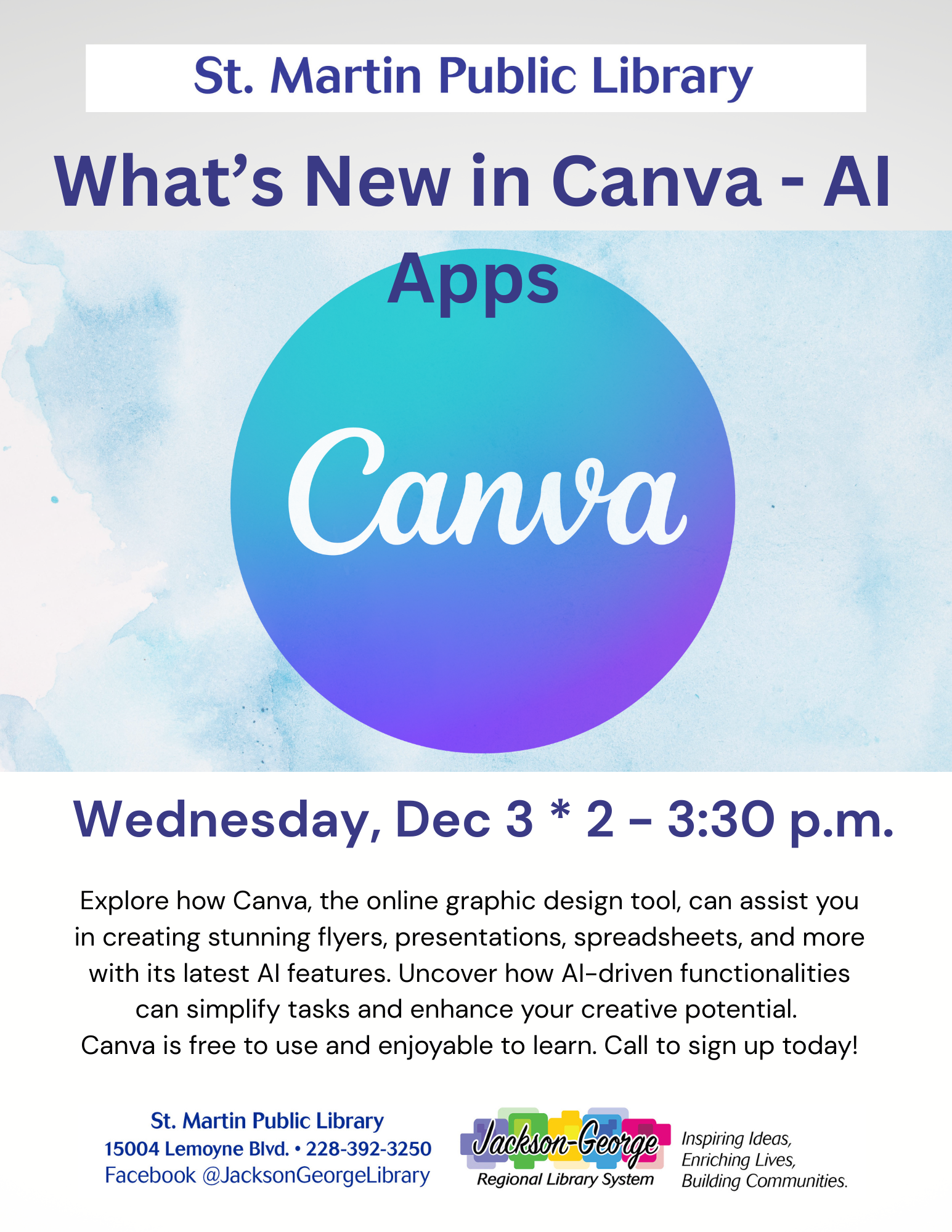 St. Martin, MS —The St. Martin Public Library invites the community to an engaging and informative workshop, “What’s New in Canva – AI Apps,” on Wednesday, December 3, from 2:00 to 3:30 p.m.