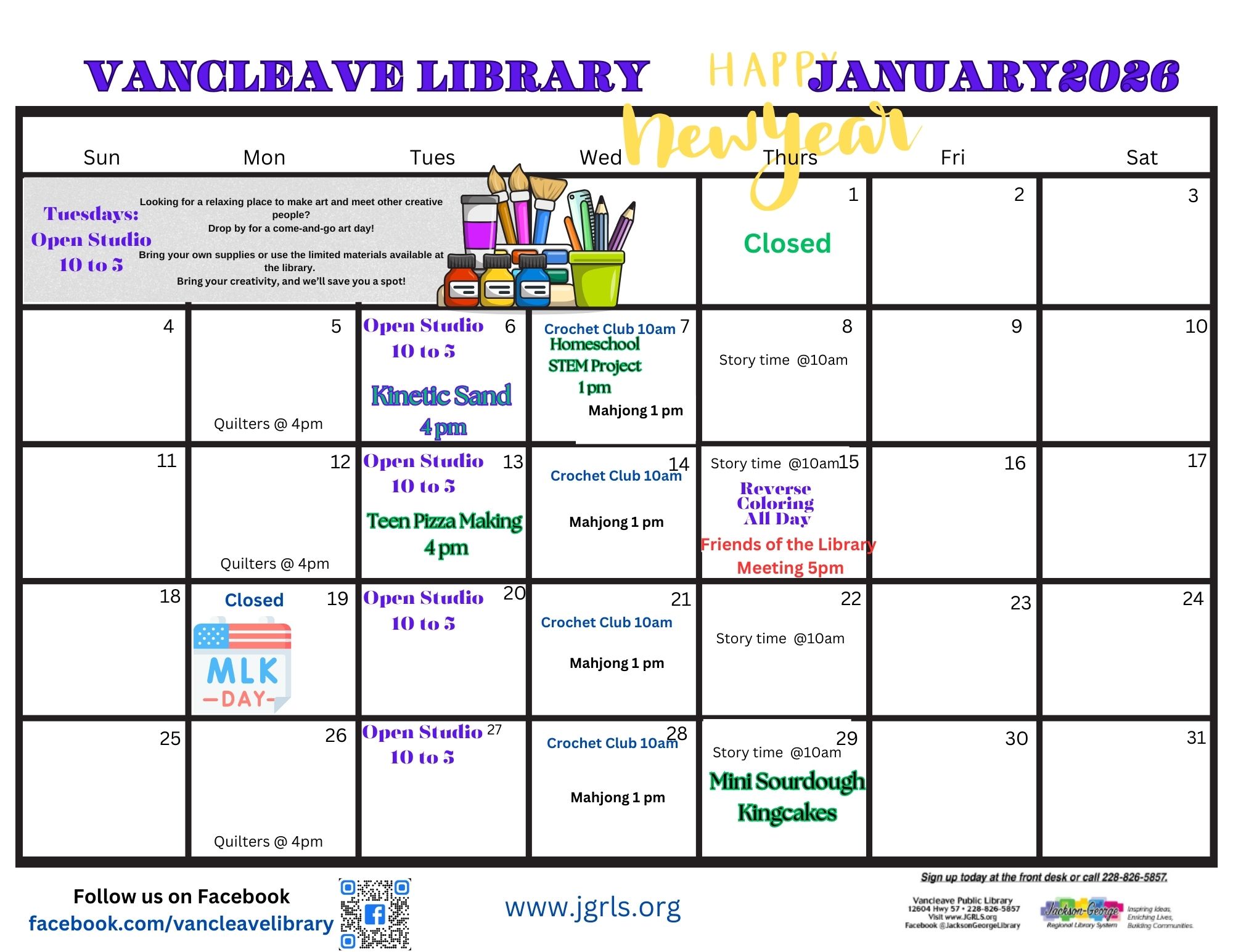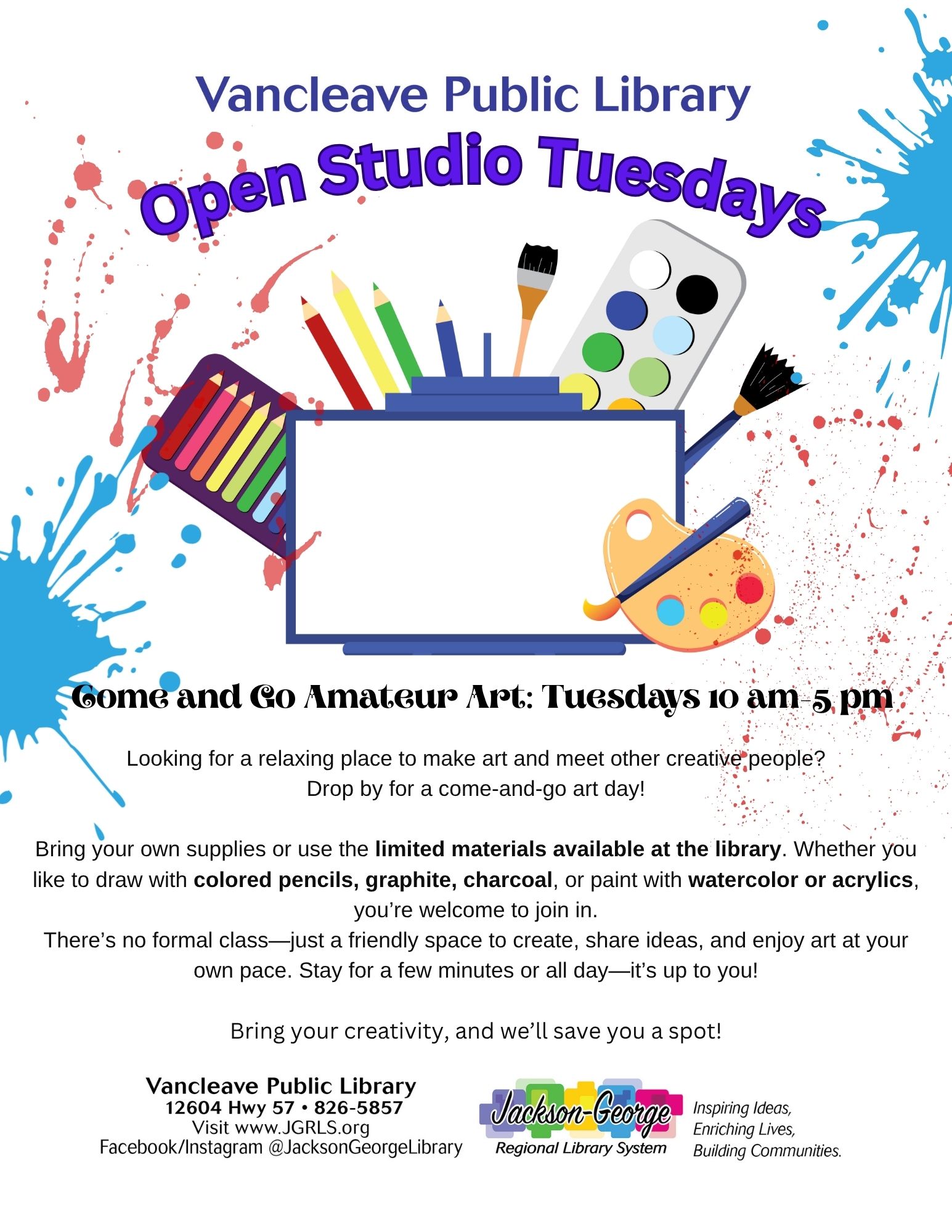 Vancleave, MS —The Vancleave Public Library invites artists, hobbyists, and anyone looking for a creative outlet to join Open Studio Tuesdays, held every Tuesday from 10:00 a.m. to 5:00 p.m.