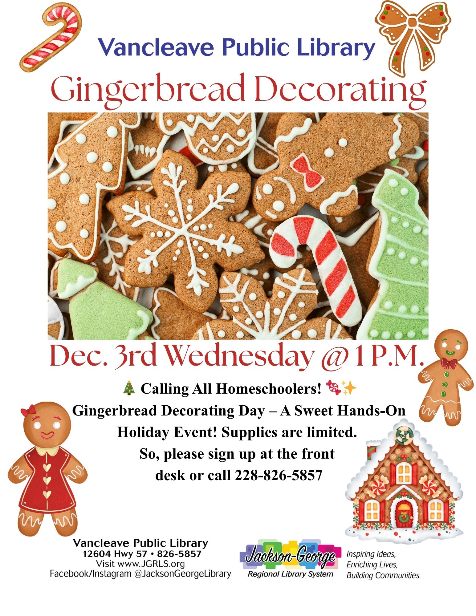 Vancleave, MS —The Vancleave Public Library invites local homeschool families to celebrate the season at a sweet and creative event: Gingerbread Decorating Day on Wednesday, December 3 at 1:00 p.m.