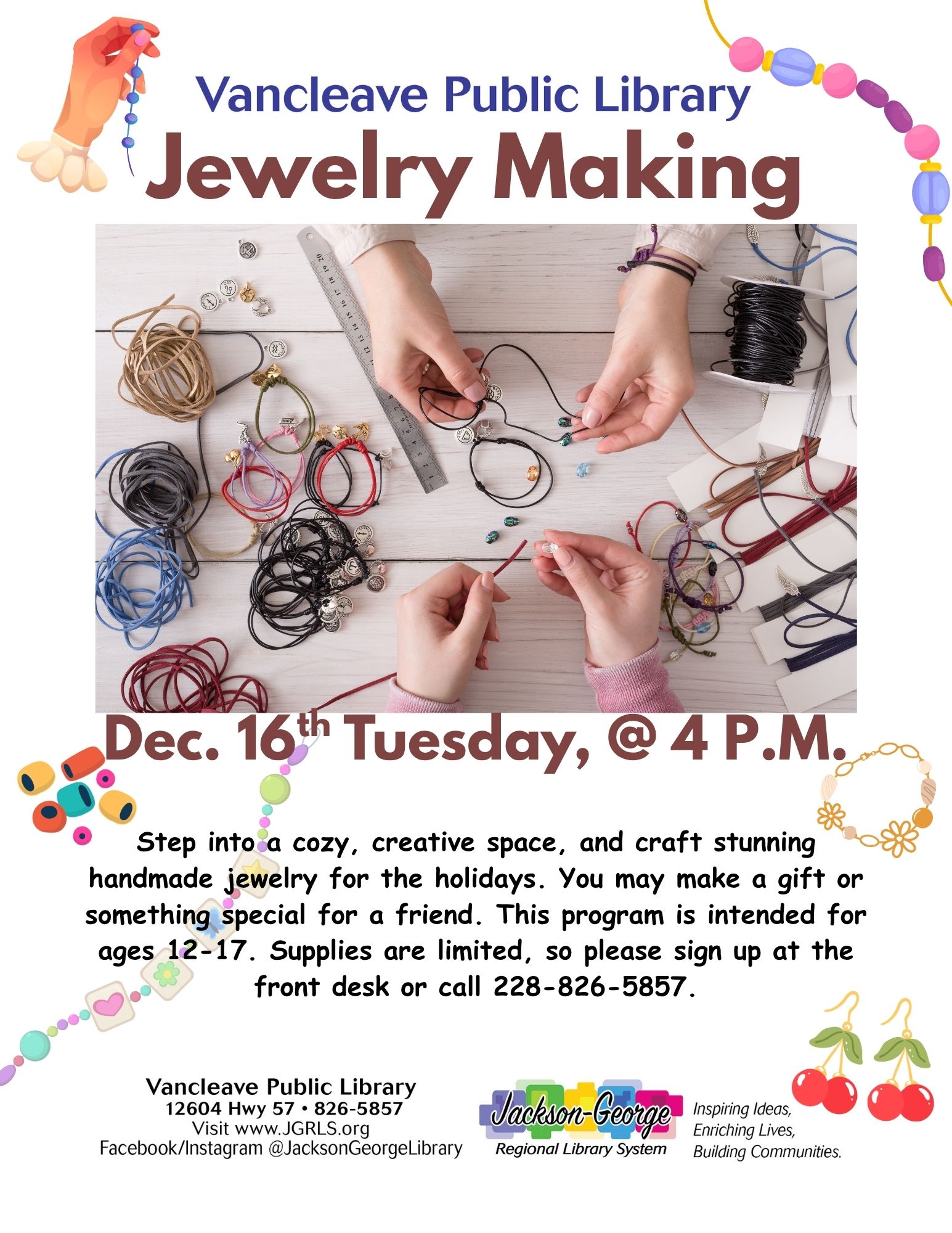 Vancleave, MS — The Vancleave Public Library invites teens to get creative this holiday season at a cozy Jewelry Making Workshop on Tuesday, December 16 at 4:00 p.m.