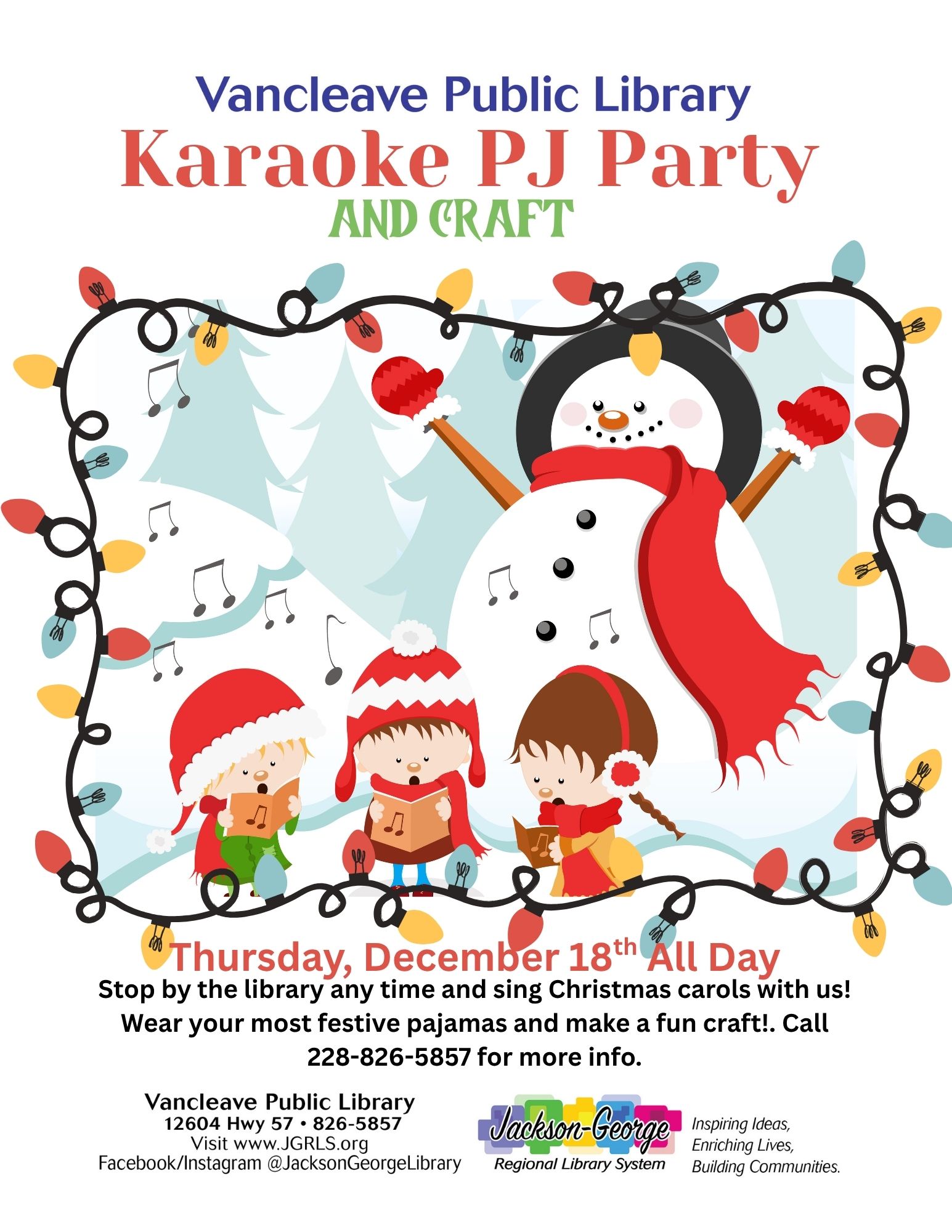 Vancleave, MS —The Vancleave Public Library invites children, teens, and families to a joyful, come-and-go celebration: the Karaoke PJ Party & Craft Day on Thursday, December 18, all day long!