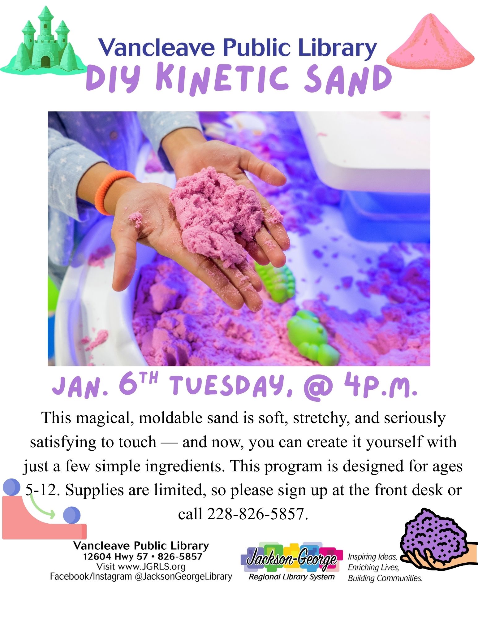 Vancleave, MS —The Vancleave Public Library invites children to get hands-on and creative at its DIY Kinetic Sand program on Tuesday, January 6, at 4:00 p.m.