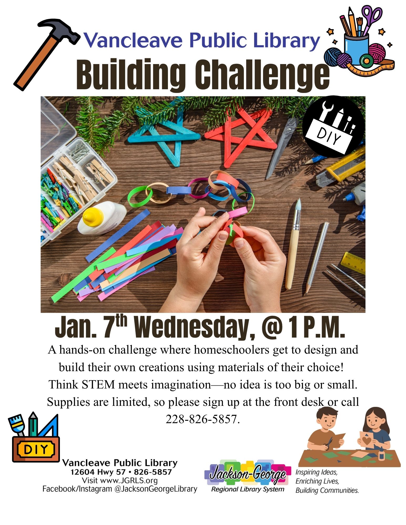 Vancleave, MS —The Vancleave Public Library invites homeschool students to put their creativity and problem-solving skills to the test at its Building Challenge on Wednesday, January 7, at 1:00 p.m.