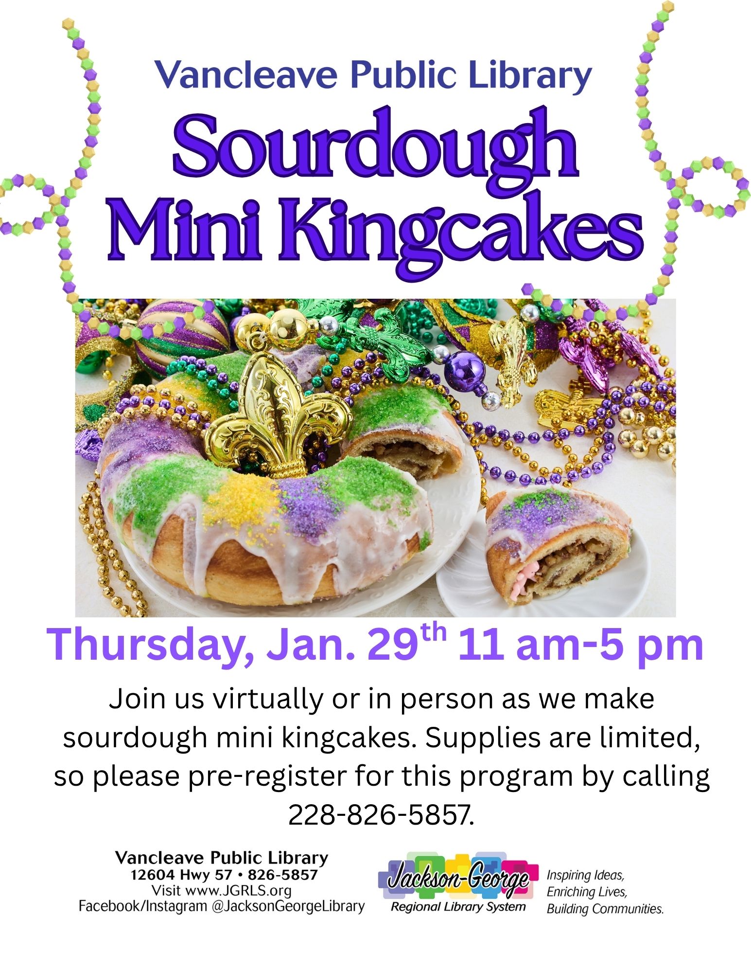 Vancleave, MS —The Vancleave Public Library invites the community to celebrate Mardi Gras with Sourdough Mini King cakes on Thursday, January 29, from 11:00 a.m. to 5:00 p.m.