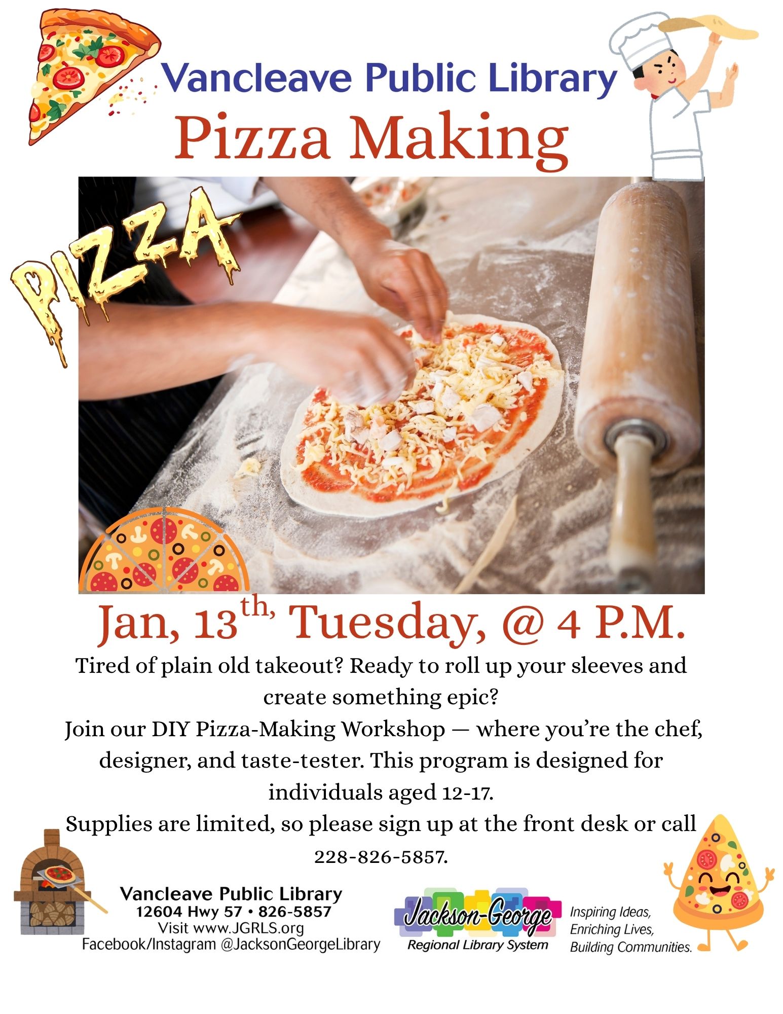The Vancleave Public Library invites teens to get creative in the kitchen at Pizza Making, a hands-on workshop taking place on Tuesday, January 13, at 4:00 p.m.