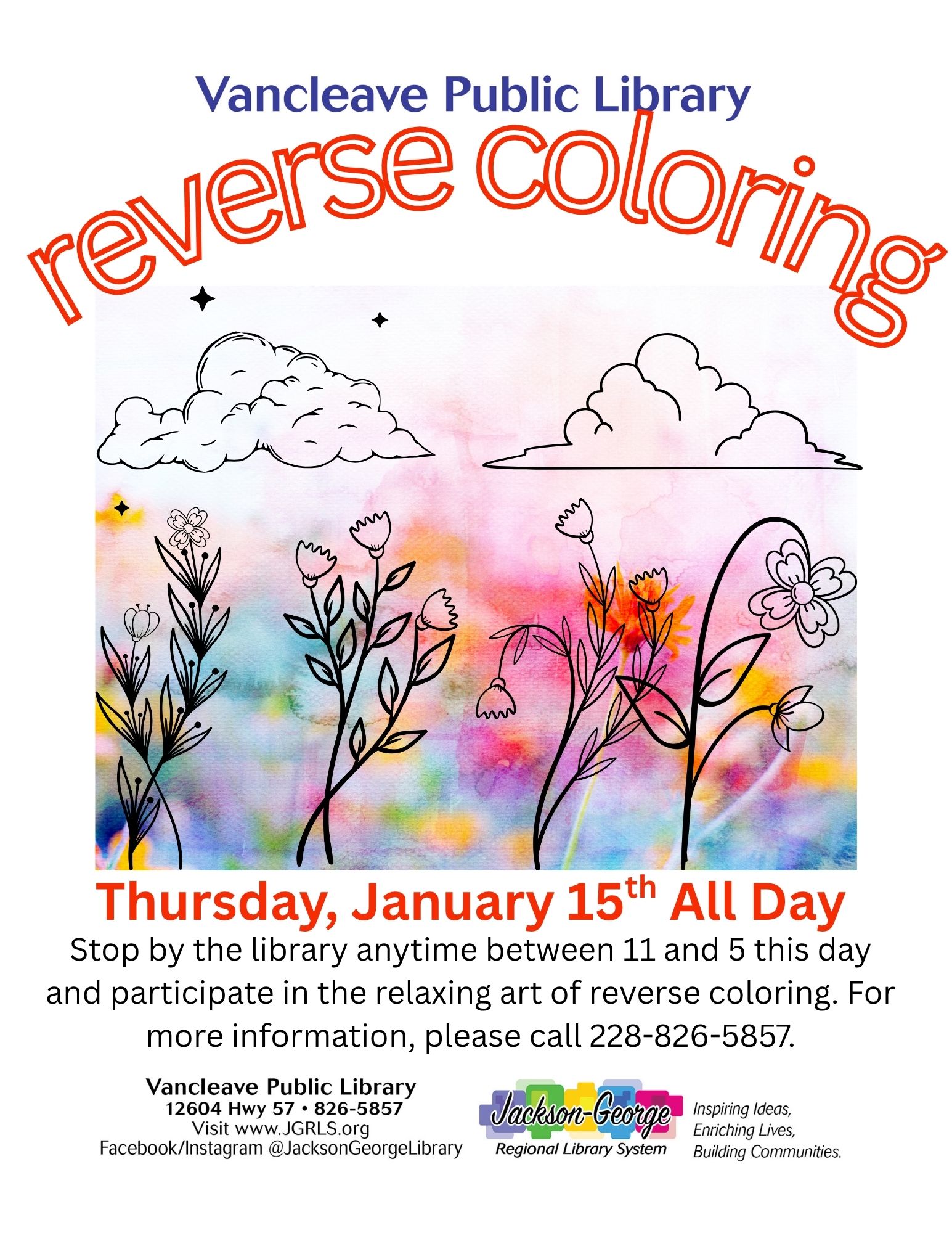The Vancleave Public Library invites the community to relax and explore creativity during Reverse Coloring, taking place Thursday, January 15, all day from 11:00 a.m. to 5:00 p.m.