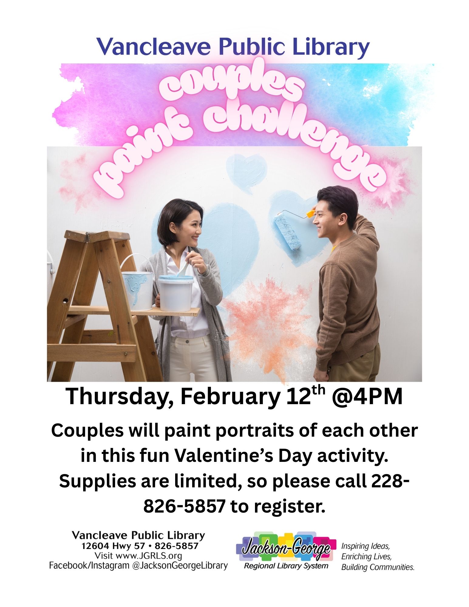 Vancleave, MS —Vancleave Public Library invites couples to celebrate Valentine’s Day with a creative twist at its Couples’ Paint Challenge on Thursday, February 12, at 4:00 p.m.
