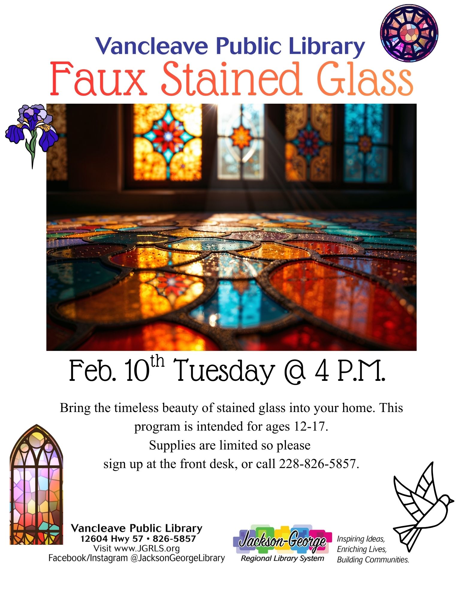 Vancleave, MS —Vancleave Public Library invites teens to explore creativity and color at its Faux Stained Glass art program on Tuesday, February 10, at 4:00 p.m. Designed for ages 12–17, this hands-on workshop will guide participants in creating their own faux stained-glass artwork inspired by the timeless beauty of traditional stained glass designs. No prior art experience is necessary, and all supplies will be provided.