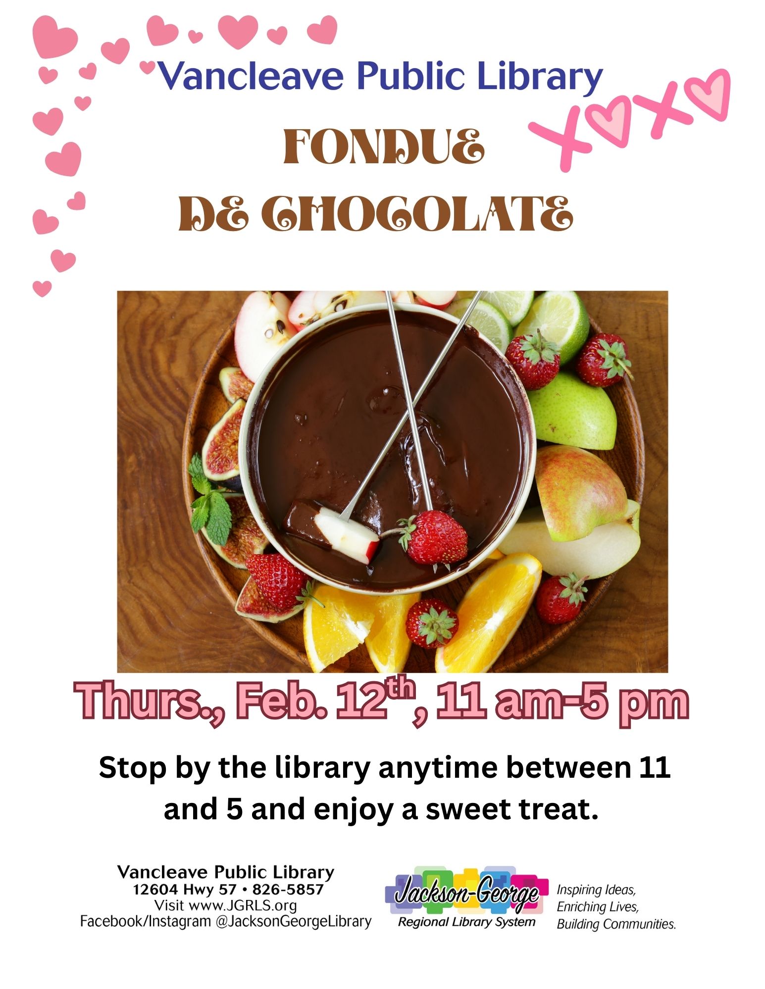 Vancleave, MS — Public Library invites the community to indulge in a sweet Valentine’s treat during Fondue de Chocolate on Thursday, February 12, from 11:00 a.m. to 5:00 p.m.